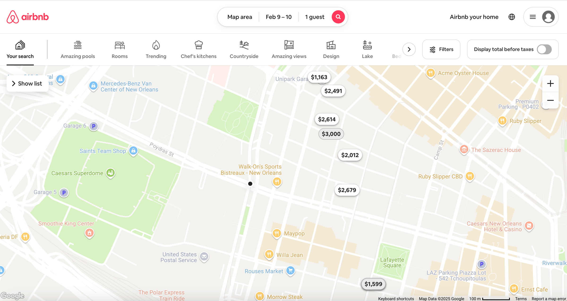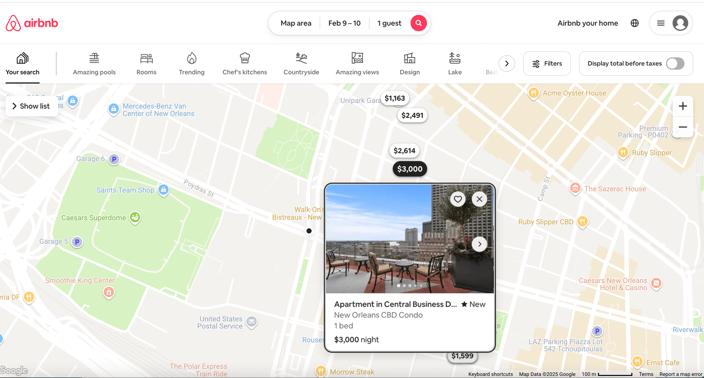 The cost of an Airbnb near Caesars Superdome tonight, 1 Guest