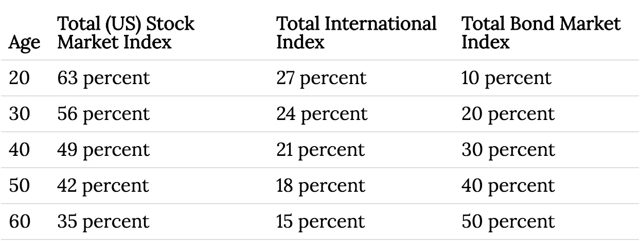 Your age minus 10 = the percentage you invest in bond funds, with the rest in stock funds. For example: